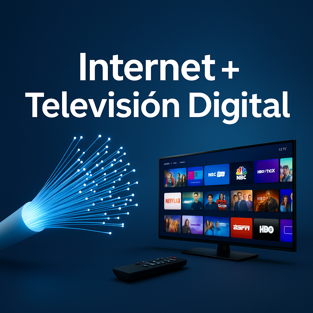 Lleva conexión y entretenimiento a toda tu familia con nuestro servicio de Internet + Televisión Digital. Disfruta de un Internet por fibra óptica, estable, rápido y sin interrupciones, ideal para estudiar, trabajar desde casa, ver tus series favoritas o jugar en línea sin preocupaciones. Además, accede a una amplia variedad de canales nacionales e internacionales en alta definición, con programación para todos los gustos: películas, deportes, noticias, infantiles, y mucho más.